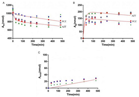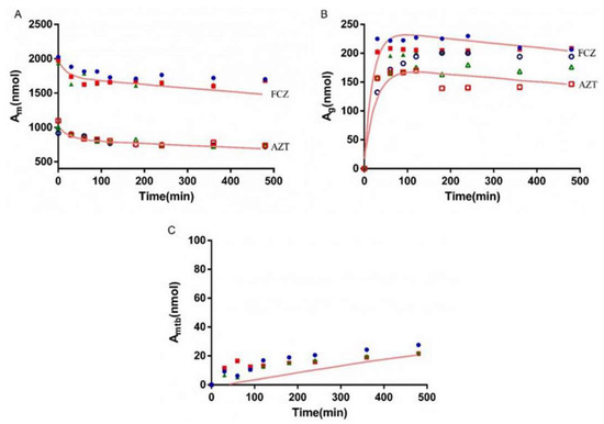 The simulated amount–time curve of AZT and FCZ in circulating mixture (A), hydrogel (B) and the simulated amount–time curve of AZTG (C) produced in the system at 500 μM of AZT and 2 mM of FCZ. Dots (n = 3): experimental data from the Bio-PK system.
