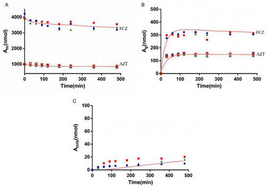 The simulated amount–time curve of AZT and FCZ in circulating mixture (A), hydrogel (B) and the simulated amount–time curve of AZTG (C) produced in the system at 500 μM of AZT and 1 mM of FCZ. Dots (n = 3): experimental data from the Bio-PK system.