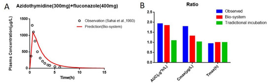 As shown in Table 7, the fold errors predicted by the FCZ PBPK models at different doses were all less than 2, and the measured FCZ plasma concentration points were close to the predicted PK curve (Figure 13), indicating the reliability of FCZ modeling. The PBPK model of FCZ was further merged into the AZT model by introducing the Ki, obtained from the Bio-PK system, to predict the effect of co-administration of FCZ on the PK of AZT in healthy people. The prediction results are shown in Table 8 and Figure 14. The predicted AUC, Cmax and Tmax were 2809.52 μg⋅h/L, 1101.02 μg/L and 0.60 h, and the corresponding predicted PK parameter ratios were 1.84, 1.32 and 1.00, respectively. Meanwhile, the fold errors were all within 2. Moreover, as shown in Figure 14, the predicted PK parameter ratios of the PBPK model parametrized with the Bio-PK system were closer to the observed ratios than those of the PBPK model constructed using Ki (145 μM) [12] from traditional microsomal testing, especially AUC ratio and Cmax ratio (fold error: 1.05 vs. 1.75, 1.36 vs. 1.73), indicating better simulation accuracy of AZT and FCZ interaction using Bio-PK system.