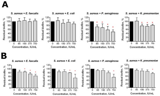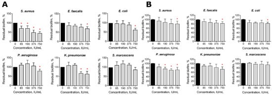 The effect of the Longidaza® treatment on bacterial biofilms. The 48-h old biofilms were gently washed with BM broth, and a fresh BM broth containing Longidaza® at concentrations of 85–750 IU/mL was loaded. After either 4 (A) or 24 (B) hours of treatment, the residual biofilms were quantified by crystal violet staining. The asterisks (*) denote a statistically significant difference of the biofilm in the untreated wells and wells treated with Longidaza® (p < 0.05).