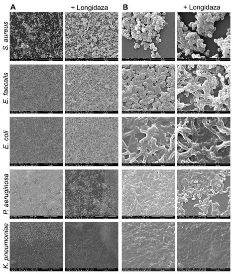 Scanning electron microscopy of 48-h old biofilms of S. aureus, E. faecalis, E. coli, P. aeruginosa and K. pneumoniae, treated for 24 h with Longidaza® at concentration of 750 IU/mL. Magnification 1500× (A) and 24,000× (B).