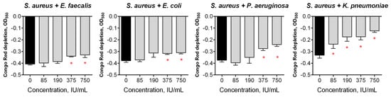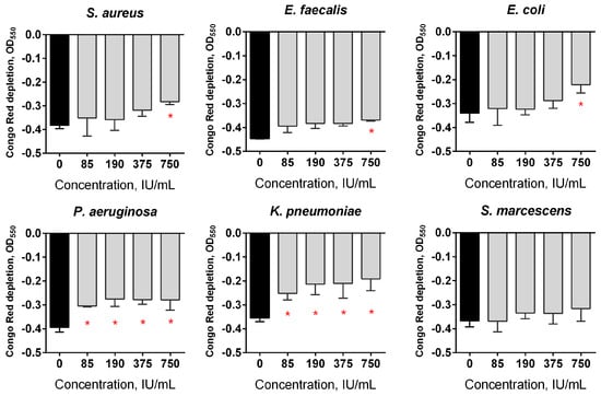 The effect of Longidaza® treatment on bacterial biofilms. The 48-h old biofilms were gently washed with BM broth, and a fresh BM broth containing Longidaza® at concentrations of 85–750 IU/mL was loaded. After 24 h of treatment, the residual biofilms were quantified using a Congo Red depletion assay. The asterisks (*) denote a statistically significant difference of the biofilm in the untreated wells and the wells treated with Longidaza® (p < 0.05).