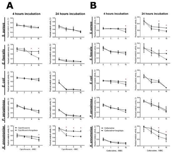 The effect of Longidaza® on the susceptibility of biofilm-embedded bacteria to antimicrobials. Longidaza® was added to 48-h-old biofilms to a final concentration of 750 IU/mL. Ciprofloxacin (A) and cefuroxime (B) were added up to final concentrations of 1–16× MBC (see Table S1 for the values). After 24 h incubation, the biofilms were washed twice with sterile 0.9% NaCl. The viability of the adherent cells was analyzed with an MTT assay. The asterisks (*) denote a statistically significant difference of the residual respiratory activity in the untreated wells (solely antimicrobials) and wells with the combined treatment (p < 0.05).