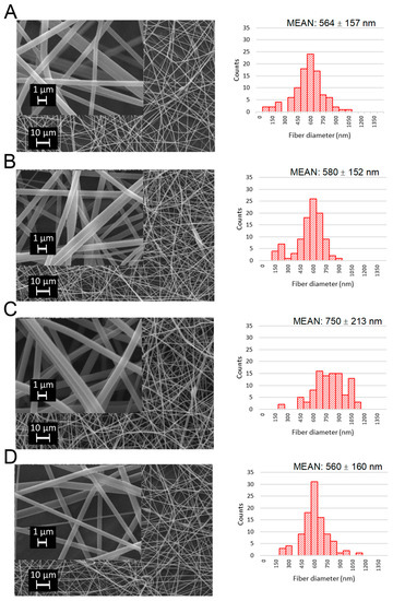 The SEM micrographs were analyzed using the image-processing computer program ImageJ, version 1.52n [38] to calculate the mean diameter of each of the fiber compositions. The diameters of 100 randomly selected nanofibers were measured on SEM micrographs to calculate the mean diameter.