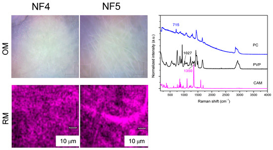 Distribution of chloramphenicol (CAM) in the electrospun nanofiber mats, measured by Raman scattering microspectroscopy (Raman mapping) and, for comparison, optical microscopy images of the fibers are provided. The characteristic Raman peaks for CAM (1350 cm−1), PVP (1027 cm−1) and PC (715 cm−1) are emphasized on the figure. Key: CAM—chloramphenicol; NF 4—nanofibers consisting 3.75% CAM + 66.25% polyvinylpyrrolidone (PVP) and 30% phosphatidylcholine (PC); NF 5—nanofibers consisting 18.75% CAM + 51.25% PVP and 30% PC; OM—optical microscopy images; PC—phosphatidylcholine; PVP—polyvinylpyrrolidone; RM—Raman mapping images.