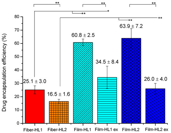 Drug encapsulation efficiency of the liposomes. The values denote the mean of drug encapsulation efficiency (%) ± SD (n = 2–3). Statistically significant differences are shown with an asterisk * (p < 0.05) and ** (p < 0.01). Key: fiber-HL—fiber-hydrated liposomes; film-HL—film-hydrated liposomes; ex—size reduced via syringe extrusion; SD—standard deviation.
