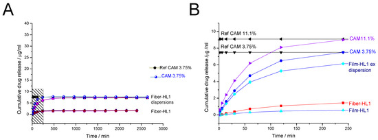 In-vitro release of CAM from CAM-loaded liposome dispersions and CAM-loaded liposomes in phosphate-buffered saline (pH 7.4, n = 3–6). Cumulative CAM release (µg/mL) from (A) fiber-hydrated liposome dispersions with lower CAM concentrations (fiber-HL1) and fiber-HL1 samples, up to the 3000 min timepoint; (B) ultracentrifuged and redispersed fiber-HL1 and film-HL1 samples, up to the 250 min timepoint. As references, solutions with 3.75%, 11.1% CAM concentrations were used directly and inserted into the membrane, and their behavior was monitored over time. Key: CAM solution 3.75%—CAM solution (7.5 µg/mL) inserted into the membrane and in a dissolution bath at 37 °C; CAM solution 11.1%—CAM solution (9.1 µg/mL) inserted into the membrane and in a dissolution bath at 37 °C; fiber-HL—ultracentrifuged fiber-hydrated liposomes (resuspended in water and inserted into a membrane); film-HL—ultracentrifuged film-hydrated liposomes (resuspended in water and inserted into a membrane); film-HL1ex—filter extruded film-hydrated liposome dispersion with lower CAM concentration inserted into a membrane; Ref fiber-HL1—CAM solution with a theoretical CAM concentration of 3.75% kept in a dissolution bath at 37 °C; Ref film-HL1—CAM solution with a theoretical CAM concentration of 11.1% kept in a dissolution bath at 37 °C. Graded area shows the region that is enlarged in figure (B).