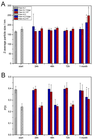 Mean size (A) and PDI (B) of self-formed fiber-hydrated liposomes (fiber-HL1 and fiber-HL2), at different timepoints, when stored at room and fridge temperatures (n = 3). Error bars show the standard deviation (SD). Statistically significant differences are shown with asterisk * (p ≤ 0.01). Key: Fiber-HL—fiber hydrated liposomes, fridge—samples stored in fridge; PDI—polydispersity index; RT—samples stored at room temperature.