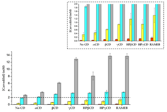 Likewise, a positive impact of citric acid on carvedilol solubilization by 2 mM βCD has been reported previously, however, this impact decreased at citric acid concentrations above 2 mM and the pH was not described [16]. Our study used a higher citric acid concentration and a known pH, and our results suggested that citric acid increases the solubilization of carvedilol by CDs—even though a carvedilol concentration of 12.3 mM was not achieved with any of the CDs tested here. This might be due to the formation of a ternary complex, as reported with hydroxy acids [24].