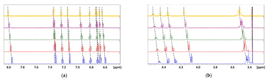 The stoichiometry of carvedilol’s inclusion complexes with βCD, γCD and DIMEB were investigated by applying Job’s method (the “method of continuous variation”) to 1H NMR analysis [9,21]. Eleven samples were prepared, with linear variations of the molar ratio of both components ranging from 0 to 1. Job plots with βCD and γCD were obtained with solutions in 0.1 M acetate buffer (pH = pKa = 4.7), and the total concentration ((carvedilol) + (CD)) was kept constant at 3.65 mM. Note that with DIMEB, the solutions were prepared in D2O with 13 mM HCl (pH ~3.5) and the total concentration ((carvedilol) + (DIMEB)) was kept constant at 2 mM. The complexes’ stoichiometry was determined from the chemical shifts of protons located in the CD cavity.