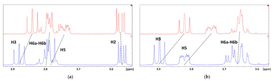 Stacking of partial 1H NMR (600 MHz, 298 K) spectra of (a) 3 mM βCD (0.1 M acetate-buffered D2O) and (b) 2 mM DIMEB (13 mM HCl in D2O) in the absence (