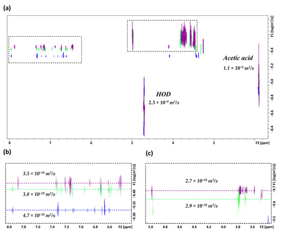 All NMR experiments were performed on an AVANCE III 600 MHz spectrometer (Bruker, Wissembourg, France) equipped with a Z-gradient unit (for pulsed-field gradient spectroscopy) and a triple resonance probe (TXI, 5-mm tube, maximum gradient strength value = 5.35 G/mm). Spectra were acquired at 298 K with close temperature control. D2O was used as the solvent, while the system’s pulsecal automation program was used to optimize the duration of the 90° pulse. Residual signal of HOD protons was used as the reference for calibration. One-dimensional NMR spectra were recorded at a resolution of 0.2 Hz (64 K data points). 1H spectra of acetate buffer samples were obtained with the Bruker sequence zg30, and 1H spectra of HCl samples were obtained by using the Bruker sequence zgcppr to delete the water signal from the added HCl. Two-dimensional (2D) DOSY 1H NMR experiments were performed using the Bruker sequence ledbpgp2s with the gradient pulse duration (δ/2) and the diffusion time (Δ) set to 1.9 ms and 50 ms, respectively. The strength of the pulsed-field gradient was increased linearly from 2% to 98% in 16 steps. The probe’s gradient calibration was based on the water signal from a 90:10 H2O/D2O mixture; a gradient strength value of 4.9 G/mm was obtained for the water diffusion value D at 2.3 × 10−9 m2/s at 298 K. The longitudinal eddy current delay and the spoil gradient delay were set to 5 ms and 0.6 ms, respectively. Spectral data were processed with the TopSpin dosy2d software module (V4.0.7, Bruker). 2D ROESY 1H NMR experiments were carried out using the phase-sensitive roesyph.2 sequence; the mixing time was set to 800 ms, with resolutions of 2.6 Hz and 21.1 Hz for F2 and F1, respectively. COSY and HSQC experiments were carried out using standard sequences of Bruker library.