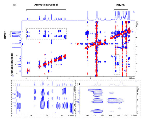 (a) A complete 2D ROESY NMR experiment (mixing time = 800 ms) with an equimolar mixture of carvedilol (2 mM) and DIMEB in 13 mM HCl in D2O, with an expanded region in the F2 dimension for (b) aromatic protons in carvedilol and (c) inner protons in DIMEB.