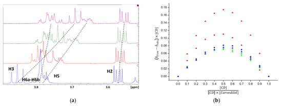 ). (b) A Job plot for a carvedilol/CD mixture obtained from 1H NMR (600 MHz, 298 K). Observation of protons located inside the CD’s cavity: H3 βCD (