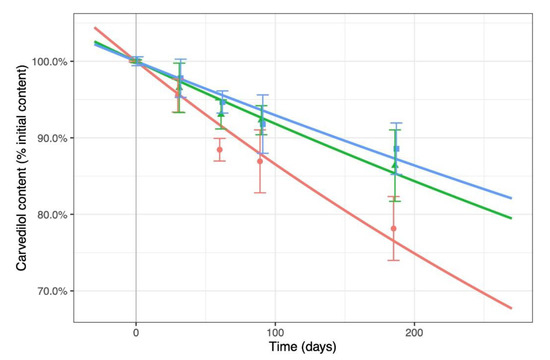 All stock solutions were prepared in volumetric flasks and filtered under aseptic conditions through sterile 0.2 μm polyethersulphone filters (PharmAssure, Pall Corporation, Port Washington, NY, USA) into sterile vials. All the vials were then sealed to avoid bacterial contamination and evaporation. Samples were stored in climatic chambers (KBF P240, Binder, Tuttlingen, Germany) and exposed to visible light (7500 lux) and ultraviolet A light (1.1 W/m2) at 298 K and 60% relative humidity. The carvedilol concentrations in n = 3 vials per solution were measured initially (T0) and 1, 2, 3 and 6 months later. The results were expressed as the amount of carvedilol relative to T0. The first-order degradation kinetics were modelled and compared using R software (version 4.0.2) [23].