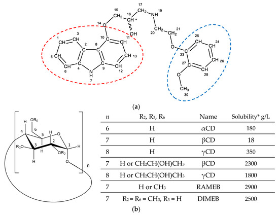 Numbered chemical structures of (a) carvedilol (carbazole and methoxyphenyl groups are highlighted by red and blue circles, respectively) and (b) the CDs used in the present study. * Solubility in water at 24 °C.