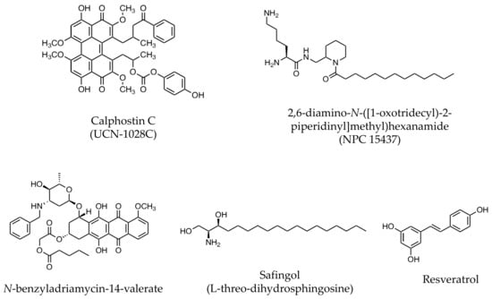Several C1 domain-binding PKC inhibitors have been reported, such as calphostin C (UCN-1028C), a compound isolated from a dark pigmented mold, Cladosporium cladosporioides (half-maximum inhibitory concentration (IC50) = 0.05 μM for rat brain PKC) [10,11], 2,6-diamino-N-([1-oxotridecyl)-2-piperidinyl] methyl) hexanamide (NPC 15437), a synthetically derived compound (IC50 = 22 μM for PKCα [12] and 19 μM for rat brain PKC [13]), N-benzyladriamycin-14-valerate (AD 198; IC50 = 9 μM for the binding of phorbol 12, 13-dibutyrate (PDBu) to rat brain PKC), a lipophilic anthracycline [14], and resveratrol, a polyphenolic phytoaxelin present in dietary sources (IC50 = 2 μM for PKCα) [15] (Figure 2). There are no reports regarding the use of these inhibitors in clinical trials.