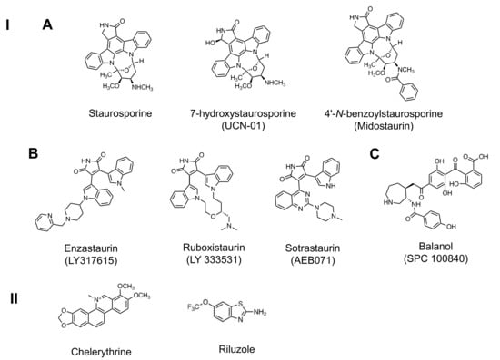 Several natural and biosynthetic indolocarbazole compounds have been identified, for example, staurosporine and its analogs such as Gö 6976, K252 compounds, 7-hydroxystaurosporine (UCN-01), and 4’-N-benzoylstaurosporine (midostaurin) (for review see [23,24,25,26]) (Figure 3). Among the staurosporine analogs, clinical trials of UCN-01 and midostaurin have been broadly carried out.