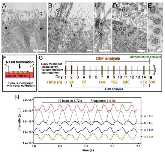The design of the repeated exposure study utilising the nasal MucilAir™ in vitro models and high-speed digital phase-contrast microscopy imaging. (A–E) Ultrastructural properties of the nasal in vitro model. (A,B) A pseudostratified epithelium with ciliated cells (A,B, white arrowheads indicate cilia), goblet cells (A,B, black asterisks), and basal cells (A, white arrows) is formed. (C) Adjacent cells are firmly connected by tight junctions (white arrow), adherent junctions (black arrow), and desmosomes (white arrowhead). (D,E) Characteristic axonemal structure with 9 × 2 + 2 arrangement of microtubules is viewed in cross section of the cilia (white arrows, D,E). Bars, 10 µm (A), 1 µm (B), 600 nm (C,D), 200 nm (E). (F) Nasal spray or culture medium was applied to the apical surface of the nasal in vitro models for 30 min daily and then washed off. (G) Cells were treated daily for 14 days, and the ciliary beat frequency (CBF) was analysed before the treatments (0 h) and at the indicated times. Ultrastructural analysis was performed at the end of the study. Lactate dehydrogenase (LDH) cytotoxicity assays were performed at the indicated times. (H) CBF measurements were performed by analysing the time-dependent greyscale intensity variations resulting from the repetitive cilia beating. Examples of the greyscale waveforms are shown, depicting the change in the grey intensity of the image at 5 different ROI as a function of time. The beat period was determined as the number of beats per unit time, from which the CBF was calculated (one divided by the beat period) and expressed in Hz.