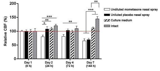 The effect of repeated doses of undiluted mometasone and placebo nasal spray, culture medium or intact condition on the ciliary beat frequency (CBF) of the nasal MucilAir™ in vitro model. Results are presented as relative CBF, expressed as a percentage of the CBF values relative to the corresponding baseline control condition for each tested group measured before treatments. The red dotted line represents 100% (the value of the control condition before treatment). Each bar represents the average relative CBF ± S.E. Mometasone nasal spray inhibits CBF as early as 24 h after the first treatment, and this inhibition persist on days 4 and 7. Placebo nasal spray significantly inhibits CBF on day 7 of continuous treatment. n = 25; two-way ANOVA with Tukey’s multiple comparisons test; * p < 0.05, ** p < 0.01, *** p < 0.0001.