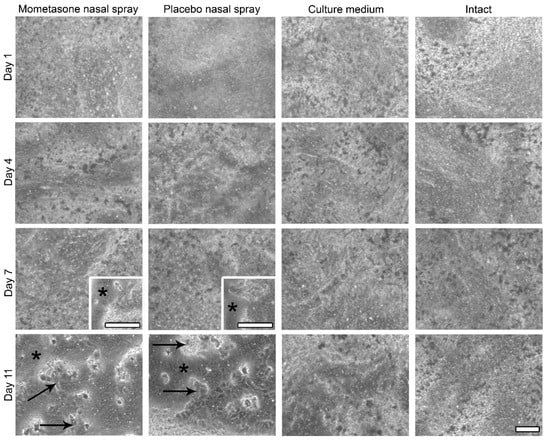 Morphological assessment of the nasal MucilAir™ in vitro models treated repeatedly with undiluted mometasone or placebo nasal spray, culture medium treated or untreated using phase-contrast microscopy. The apical surface view is shown. Cell shedding is observed in the undiluted mometasone- and placebo-treated nasal MucilAir™ in vitro models, which starts at the periphery on day 7 (inserts). Cell detachment is almost complete on day 11. Asterisks indicate areas without cells; arrows indicate the remaining cells on the growth surface. Scale bars, 100 µm.