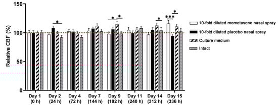Since nasal formulations administered into the nostrils are diluted by mucus under physiological conditions, we tested the effect of repetitive exposure with 10-fold diluted concentrations of the nasal sprays. The dilution factor of 10 has been described as clinically relevant [35,38,46]. Mometasone nasal spray did not impair ciliary activity; no statistical differences compared to the intact nasal MucilAir™ in vitro models were found (Figure 4, Supplementary Table S2, Supplementary Videos S12–S14). Similarly, placebo nasal spray did not impair CBF compared to the intact nasal in vitro models (Figure 4, Supplementary Table S2, Supplementary Videos S15–S17). On day 2, the CBF values in the placebo-treated cultures even increased compared to the intact nasal in vitro models (Figure 4, Supplementary Table S2). Conversely, daily treatment with culture medium increased CBF in the second week of treatments. Namely, CBF increased with time compared to the baseline CBF (time point 0 h). On days 9 and 14, the CBF increased compared to the mometasone-treated and intact nasal in vitro models (Figure 4, Supplementary Table S2, Supplementary Videos S18–S20 (culture medium-treated) and Supplementary Videos S21–S23 (intact nasal in vitro models)). On day 15, the mometasone-treated nasal in vitro models exhibited higher CBF values than those of the placebo- and culture medium-treated nasal in vitro models (Figure 4, Supplementary Table S2).