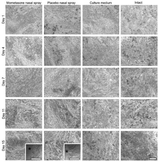 However, we observed cell shedding at the periphery of the mometasone- and placebo-treated nasal in vitro models on days 14 and 15. Conversely, cell shedding was not observed in the culture medium-treated and intact nasal in vitro models (Figure 5, Supplementary Figure S2).