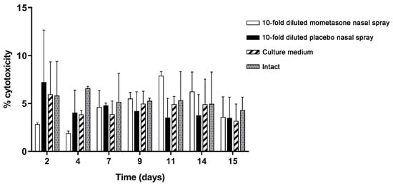 The nasal MucilAir™ in vitro models were repeatedly exposed for 2 weeks to 10-fold diluted mometasone nasal spray, 10-fold diluted placebo nasal spray, or culture medium (controls) (Figure 6). Results were compared to the intact nasal MucilAir™ in vitro models (untreated cultures), which were analysed following the same protocol as the treated cultures. Cytotoxicity was very low in all nasal in vitro models (treated and untreated). Furthermore, 10-fold diluted mometasone or placebo nasal spray did not exhibit significantly different cytotoxicity compared to the controls (culture media-treated and intact cultures) (Figure 6, Supplementary Table S3). These results imply that the tested nasal sprays do not exert higher cytotoxicity than the culture media.