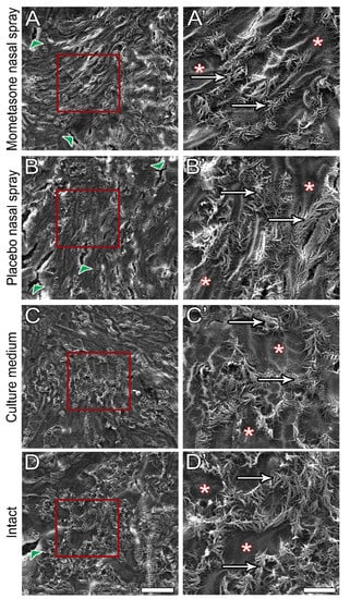 Post-treatment ultrastructural SEM analysis of the apical surface topography of the nasal MucilAir™ in vitro models. Cultures were treated with 10-fold diluted mometasone nasal spray (A,A’), 10-fold diluted placebo nasal spray (B,B’), or culture medium (C,C’) for 14 consecutive days. Intact cultures were not treated (D,D’). Ciliated cells (arrows) and non-ciliated cells (asterisks) with apparent cell boundaries are observed in all cultures, regardless of the treatment. Arrowheads indicate artefacts. The red framed areas in images (A–D) are magnified in (A’–D’). Scale bars, 50 µm (A–D) and 25 µm (A’–D’).