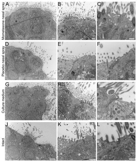 Post-treatment ultrastructural TEM analysis of the nasal MucilAir™ in vitro models. Cultures were treated with 10-fold diluted mometasone nasal spray (A–C), 10-fold diluted placebo nasal spray (D–F), or culture medium (G–I) for 14 consecutive days. Intact cultures were not treated (J–L). Ciliated and non-ciliated cells are connected with junctional complexes (arrowheads in B,E,H,K) in all MucilAir™ cultures (treated and untreated). Well-formed tight junctions are seen in higher magnifications (arrows in C,F,I,L). Scale bars, 6 µm (D), 4 µm (J), 2 µm (A,G), 1 µm (B,E,H,K), 600 nm (F), and 400 nm (C,I,L).