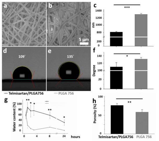 (a) Blended nanofibrous membranes of telmisartan/PLGA 756 and (b) plain PLGA 756. (c) Mean fiber diameters in both nanofiber groups. (d) Water contact angles of telmisartan/PLGA 756 and (e) plain PLGA 756. (f) Mean contact angles in both groups. (g) Difference between water contents of two nanofibers after 24 h of PBS immersion and (h) their porosities. (*** p < 0.001; ** p < 0.01; * p < 0.05).