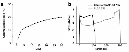 (a) Accumulated release of telmisartan and (b) stress–strain curves of telmisartan-loaded and plain PLGA 756 nanofibrous membranes.