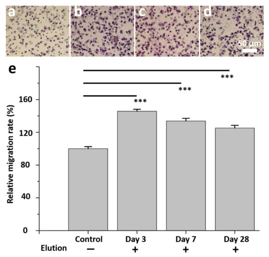In vitro study of eluent of telmisartan/PLGA 756 scaffolds to test endothelial progenitor cells migration for two hours. (a) Control group without eluent. (b) EPCs with day 3 eluent. (c) EPCs with day 7 eluent. (d) EPCs with day 28 eluent. (e) Migration of cells in control group is significantly less than telmisartan/PLGA 756 scaffolds group. (*** p < 0.001).