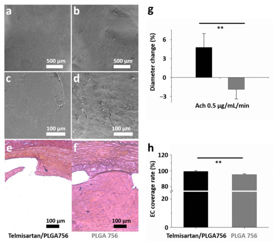 On day 28, the data were collected for ((a,b), 35×; (c,d), 200×) morphology of endothelium under various magnifications and (e,f) response of intimal hyperplasia after four weeks of stenting treatment. (g) In vivo endothelial function was evaluated from variation in abdominal aorta diameter using acetylcholine (Ach) infusions. (h) Endothelium coverage in different groups. (** p < 0.01).