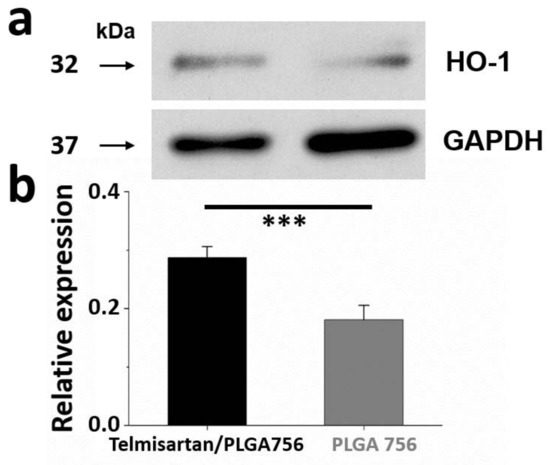 (a) Western blot of HO-1 content. (b) Relative expression was quantified using densitometry as ratio of density to GAPDH. (*** p < 0.001).