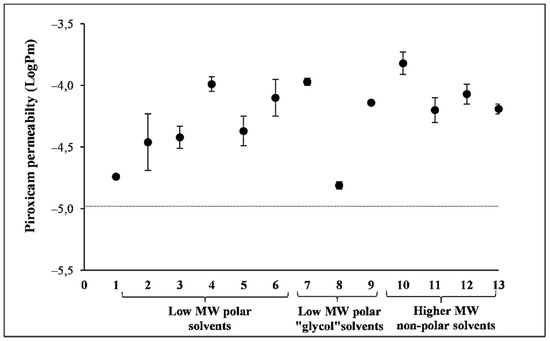 No solvent effect was recorded on the visual appearance of the membranes after their removal and before the addition of piroxicam solution. The logPm of piroxicam from aqueous solution measured across each solvent-treated membrane ranged between −3.82 and −4.81, with a mean of −4.25 ± 0.30 (Figure 1). This fits well with the reference logPm value of −4.98 ± 0.01 that was measured previously in an aqueous solution using this PAMPA model [22]. All permeability values of piroxicam were within one order of magnitude of the previous control logPm value. Variation, i.e., the SD of the permeability values of piroxicam, provides a good indication of membrane integrity. Extreme high standard deviation would indicate membrane damage. As shown in Figure 1, the error bars are small (average SD ± 0.08), with ethanol (S2) presenting the highest variation (SD: ± 0.23) and thus the largest effect on the membrane, but this SD is still acceptable, indicating an interaction of ethanol with the membrane rather than its corruption.