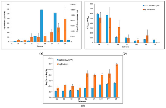 (a) Comparison of the permeability of PER in different solvents across Skin-PAMPA membranes (blue bars) and pig skin (orange bars), expressed as flux (no close correlation); (b) permeated amount (R2 = 0.834, n = 7); (c) permeability coefficient, logPm and logKp for Skin PAMPA and pig skin, respectively (R2 = 0.844, n = 9). All values are mean ± SD.