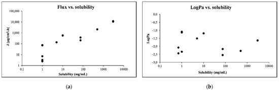 (a) Comparison of the solubility of PER with flux; (b) logPm. All values are mean.