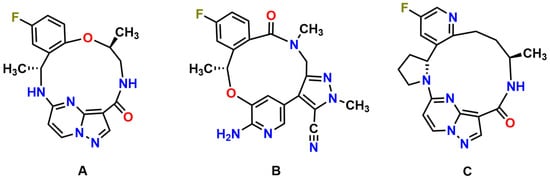 Molecular structures of repotrectinib (A) (MW = 355.37 g/mol), lorlatinib (B) (MW = 406.42 g/mol), and selitrectinib (C) (MW = 380.42 g/mol).