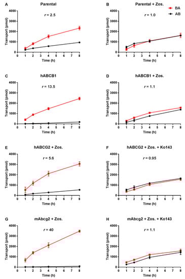 Transepithelial transport of repotrectinib (5 µM) assessed in MDCK-II cells either non-transduced (A,B), transduced with hABCB1 (C,D), hABCG2 (E,F) or mAbcg2 (G,H) cDNA. At t = 0 h, repotrectinib was applied in the donor compartment (either apical or basolateral) and the concentrations in the acceptor compartment at t = 1, 2, 4, and 8 h were measured and plotted as repotrectinib transport (pmol) in the graph (n = 3). B, D–H: Zos. (zosuquidar, 5 μM) was applied to inhibit human and/or endogenous canine ABCB1. F and H: the ABCG2 inhibitor Ko143 (5 μM) was applied to inhibit ABCG2/Abcg2-mediated transport. r, efflux transport ratio. BA (■), translocation from the basolateral to the apical compartment; AB (●), translocation from the apical to the basolateral compartment. Points, mean; bars, S.D. Data are presented as mean ± S.D. (n = 3).