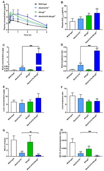 Of note, during the experiment we observed mild toxicity signs in Abcb1a/1b;Abcg2−/− mice, including hypoactivity and continuously closed eyes, at 1–2 h after oral administration. These signs of toxicity disappeared around 4 h. In contrast, no noticeable toxicity symptoms were found in wild-type mice.