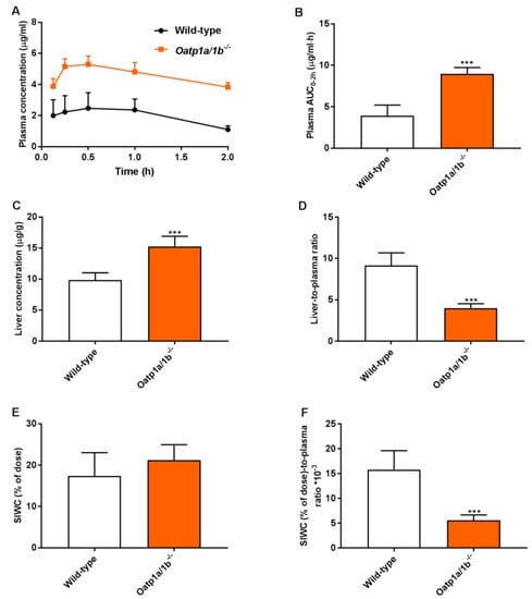 Plasma concentration-time curves (A), plasma AUC0–2h (B), liver concentration (C), small intestine with content (SIWC) as percentage of dose (E), and liver- and SIWC (% of dose)-to-plasma ratios (D,F) of repotrectinib in male wild-type and Oatp1a/1b−/−/− mice 2 h after oral administration of 10 mg/kg repotrectinib. SIWC (% of dose), drug percentage of dose in small intestine with content, which was expressed as total repotrectinib in SIWC divided by total drug administered to the mouse. Data are presented as mean ± S.D. (n = 6–7). ***, P < 0.001 compared to wild-type mice.