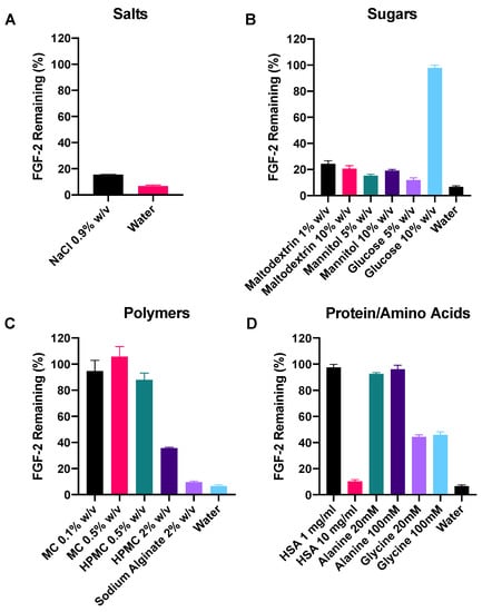 Effect of excipients on the stability of FGF-2 aqueous solution (770 ng/mL) incubated at 25 °C for 2 h. Excipients were selected from the four classes of protein stabilisers, (A) salts (B) sugars, (C) polymers and (D) protein/amino acids. FGF-2 content as analysed by ELISA following the incubation period is expressed as a percentage of the baseline FGF-2 content (mean ± SD, n = 3). Excipient abbreviations: sodium chloride, NaCl; methylcellulose, MC; hydroxypropyl methylcellulose, HPMC; and human serum albumin, HSA.