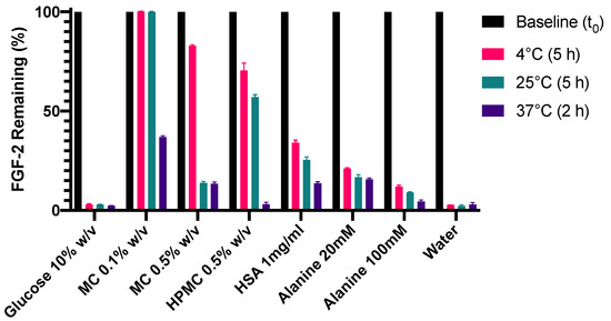 Stabilisation of FGF-2 solutions to temperature stressors was evaluated at 4 °C, 25 °C and 37 °C. Glucose 10% w/v was not effective at sufficiently stabilising the FGF-2 solution at all three prescribed storage conditions whereas MC 0.1% w/v showed a strong stabilisation effect (Figure 4), retaining 100% FGF-2 content after 5 h at 4 °C and 5 h at 25 °C. MC 0.1% w/v also produced superior FGF-2 stabilisation at 37 °C compared to the other excipients (p < 0.0001), but was not successful at maintaining FGF-2 content above 90% after 2 h at 37 °C. The effectiveness of the polymers in stabilising the FGF-2 solution to the prescribed temperature stressors may be ranked in the decreasing order of MC 0.1% w/v > HPMC 0.5% w/v > MC 0.5% w/w. In the protein/amino class, HSA 1 mg/mL was more effective than alanine 20 mM, and alanine in turn was more effective at 20 mM than at 100 mM in stabilising FGF-2 at all three storage conditions (p < 0.0001). None of the excipients were able to sufficiently stabilise the FGF-2 solution for 2 h at 37 °C, although MC 0.5% w/v, HSA 1 mg/mL and alanine 20 mM produced a greater stabilisation effect when compared to water alone (p < 0.0001).