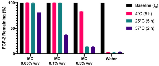 With MC exhibiting concentration-dependent stabilisation effects on FGF-2, being more effective at 0.1% than at 0.5% (Figure 4), the stabilisation effect of MC was evaluated at a lower concentration of 0.05% w/v. Figure 5 shows that MC at 0.05% w/v indeed resulted in improved stability of FGF-2 at 37 °C (p < 0.0001). Compared with MC 0.1% and MC 0.5%, which retained residual FGF-2 contents of 36.9% and 13.4%, respectively, after 2 h at 37 °C, MC 0.05% could retain 81% of baseline FGF-2 content after similar heat exposure.