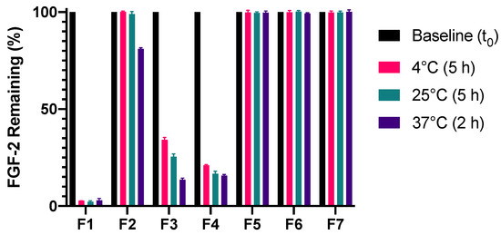 Effect of excipient combinations on the stability of FGF-2 aqueous solutions (770 ng/mL) incubated at 4 °C for 5 h, 25 °C for 5 h and 37 °C for 2 h. Residual FGF-2 content following incubation was measured by ELISA and expressed as a percentage of the baseline concentration (mean ± SD, n = 3). Abbreviations of samples: F1, FGF-2 in water; F2, FGF-2 and 0.05% w/v methylcellulose (MC) in water; F5, FGF-2, 0.05% w/v MC and 20 mM alanine in water; F6, FGF-2, 0.05% w/v MC and 1 mg/mL human serum albumin (HSA) in water; and F7, FGF-2, 0.05% w/v MC, 20 mM alanine and 1 mg/mL HSA in water.