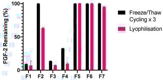 F2, F5, F6 and F7 were stable against repeated freeze/thaw cycles, with ≥99.8% baseline FGF-2 measured in these samples after the third cycle of processing (Figure 8). By comparison, F3 and F4 were unable to sufficiently protect FGF-2 during repeated freeze/thaw cycles, with F3 no better than the F1 control (p = 0.0929) and F4, while more stable than F1 (p < 0.0001), demonstrating a residual FGF-2 content of 32.5% which was unacceptably low.