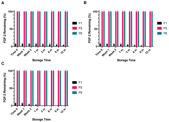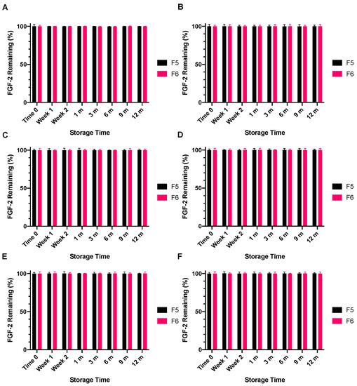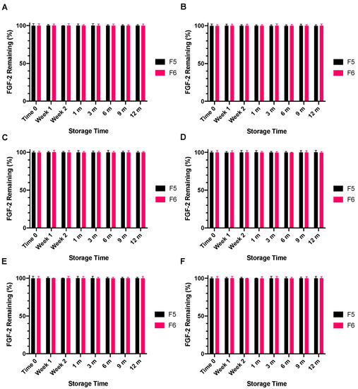 Immediately following lyophilisation, only 7.1% of the baseline FGF-2 content of F1 had remained, representing a significant drop in FGF-2 content (Figure 9). This FGF-2 level was maintained when the lyophilised F1 powder was stored at −4 °C for 12 months (p = 0.9367). When the storage temperature was increased to 4 °C, the FGF-2 content in F1 was maintained for only 9 months, with further storage leading to undetectable levels of FGF-2 in the lyophilised F1 powder at 12 months. Storage at the higher temperature of 18 °C caused the FGF-2 content of the lyophilised F1 powder to fall below the detectable limit at 3 months. By comparison, F5 and F6 were not only stable to lyophilisation, but the lyophilised F5 and F6 powders were also stable to storage at −4 °C, 4 °C and 18 °C for up to 12 months. The FGF-2 contents in the lyophilised F5 and F6 powders remained above 99% of baseline levels throughout the duration of the prescribed storage conditions.
