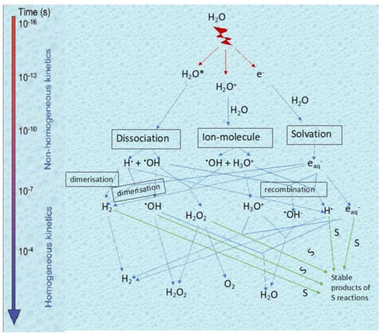 The interaction of radiation with water starts with an energy deposition which initially forms ionized water molecules (H2O+), excited water molecules (H2O*) and sub-excitations electrons (e−) [47,49,50]. This initial step is referred to as the physical stage, and occurs in about 0–10−15 s. The next step, known as the physico-chemical stage, involves a whole host of fast reactions (10−15–10−12 s), where molecules are rearranged and electrons are thermalized and hydrated. The in-depth description of these reactions is beyond the scope of this text. It is in this stage that radicals first appear in our system. The final stage is the chemical stage (10−12–10−9 s), where the species diffuse in solution and can react with solutes present in the system. Figure 1 summarizes the three stages of water radiolysis.