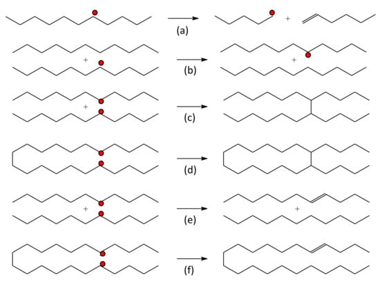 Other types of reactions may also occur in a polymer irradiated in solutions. For example, two macroradicals may react and form C–C double bonds. This process is called a disproportionation reaction (Figure 2e,f). Here, no crosslink is formed except for a double bond formation at one of the parent radical sites. Disproportionation reactions can be inter- or intramolecular. Neither leads to nanogel synthesis because there is no polymer crosslinking involved. Macroradicals can also experience degradation in which bonds are broken at various locations of the polymer chain. Degradation (or chain scission) causes the polymer chain to break two chain fragments, with one containing a terminal radical (Figure 2a). H-atom shift or a radical transfer can also occur (Figure 2b) between short or distant chain segments. H-atom shifts have also been reported to occur between separate chains.